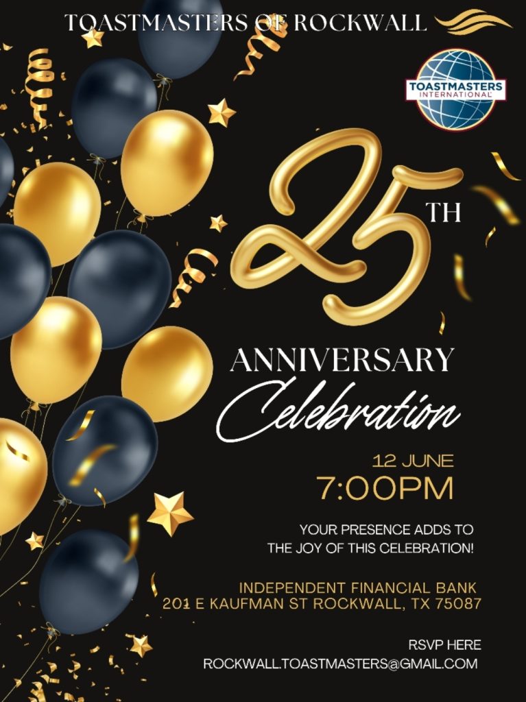 Rockwall, TX (May 21, 2025) – Toastmasters of Rockwall invites the community to join them for a celebration of their 25th anniversary! The celebration kicks off on Thursday, June 12th at 7:00PM at Independent Financial Bank in downtown Rockwall. Guests are welcome to bring their friends and family — there is no cost or obligation to attend. RSVP to Rockwall.Toastmasters@gmail.com