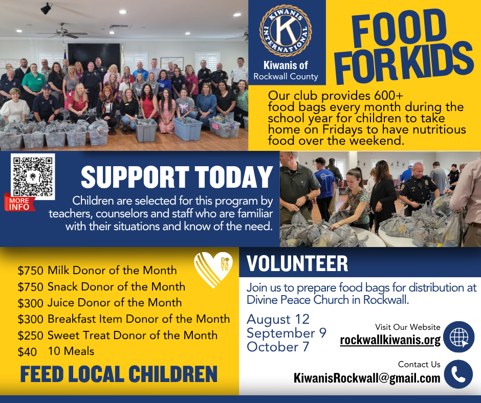 Rockwall, TX (July 21, 2025) – The Kiwanis Club of Rockwall County is calling on the community to help support its Food For Kids program as it gears up for another impactful year. The program provides more than 600 food bags each month during the school year, ensuring local children have access to nutritious meals over the weekend.