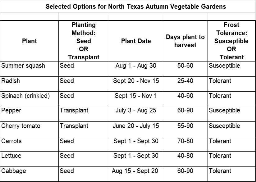 Considerations when deciding what to plant in your autumn garden include: average first frost date (for Rockwall County November 15-17), length of time from planting to harvest, planting from seeds or transplants, and tolerance of frost. Plants susceptible to frost will be killed or damaged with temperature of 32 F. Susceptible plants can be protected from frost by moving them to an enclosed, protected area or by covering with frost cloth. The table below provides information that will help in planting decisions.