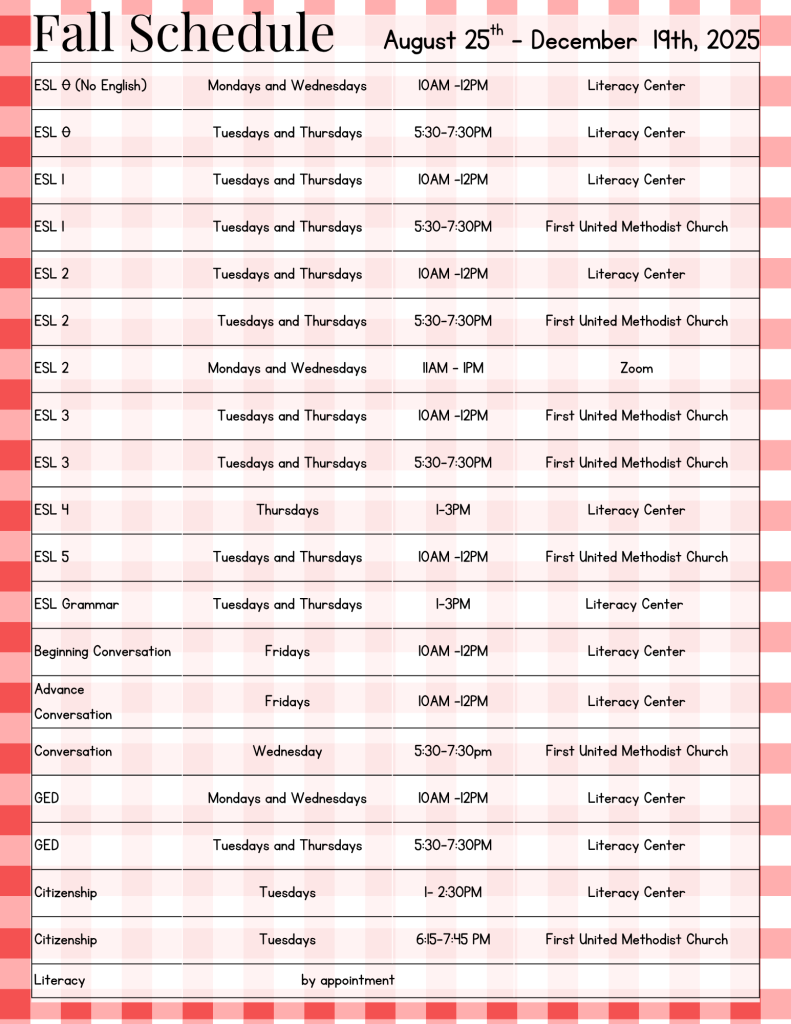 Classes through the Adult Literacy Center are free (small book fee) with class times offered in the morning, afternoon, and evening. Check out the schedule – Fall classes start August 25. Click here for a Spanish version.