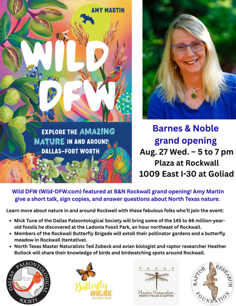 Rockwall, TX (August 18, 2025) – Get to know the nature of North Texas and meet the nature stewards and explorers of Rockwall at the grand opening of the area’s latest Barnes & Noble. Amy Martin will be on hand to give a short talk and sign copies of Wild DFW: Explore the Amazing Nature Around Dallas-Fort Worth from Timber Press.