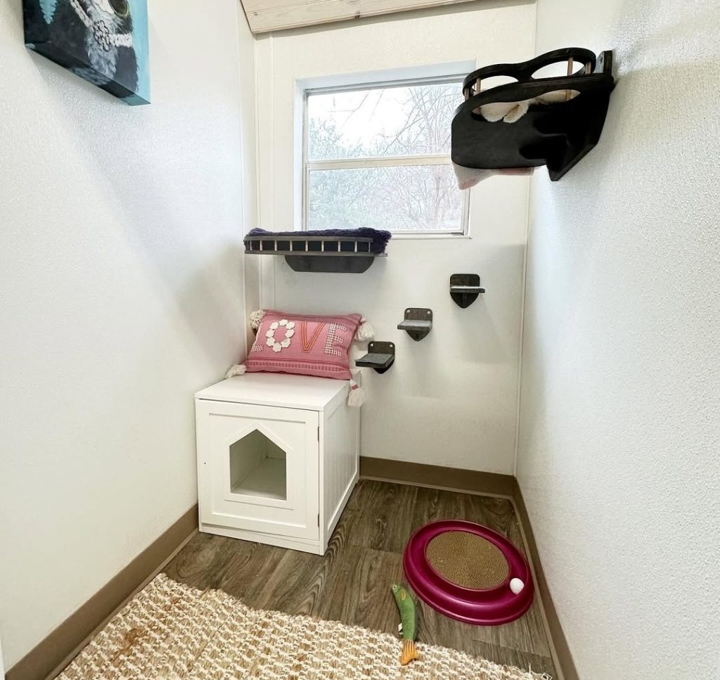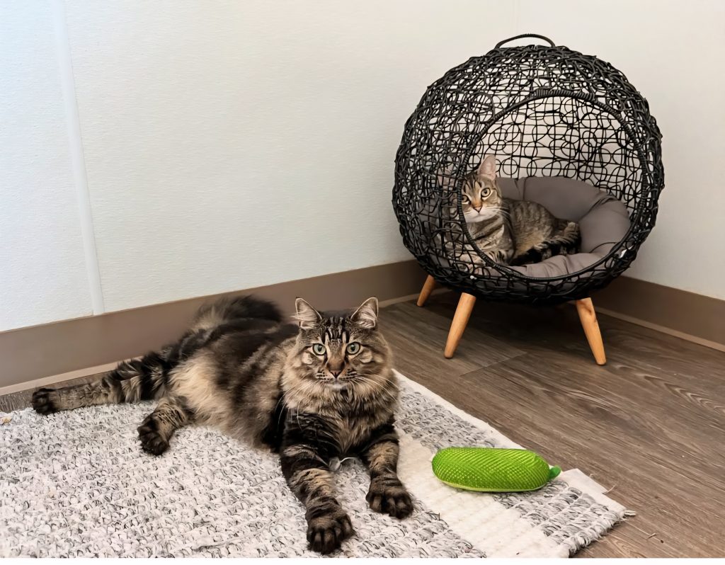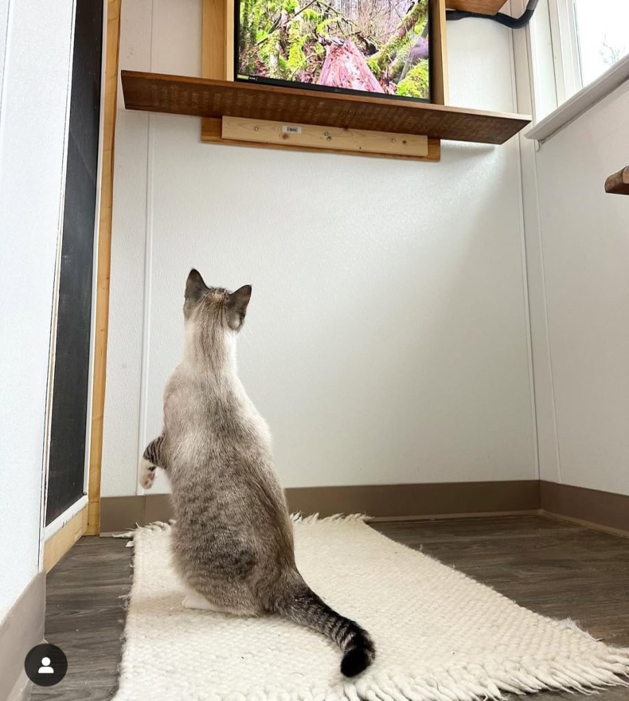 Now, her “hotel” offers private cat rooms decorated with levels for climbing, windows for sunbathing, nooks for hiding, and even streaming bird videos. Each client is assured that their feline friend is happily cared for while they are away from home – receiving regular updates and photos. Because being away from their normal world is stressful for most cats, Stacy gives them all the comforts of home and plenty of attention and love.