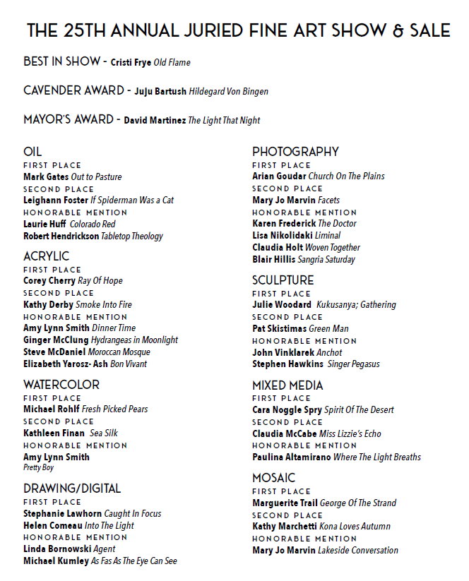 BEST IN SHOW went to Cristi Frye for Old Flame. Juju Bartush won the CAVENDER AWARD for Hildegard Von Bingen. The MAYOR’S AWARD was presented to David Martinez for The Light That Night. Congratulations to all the award-winning artists below: