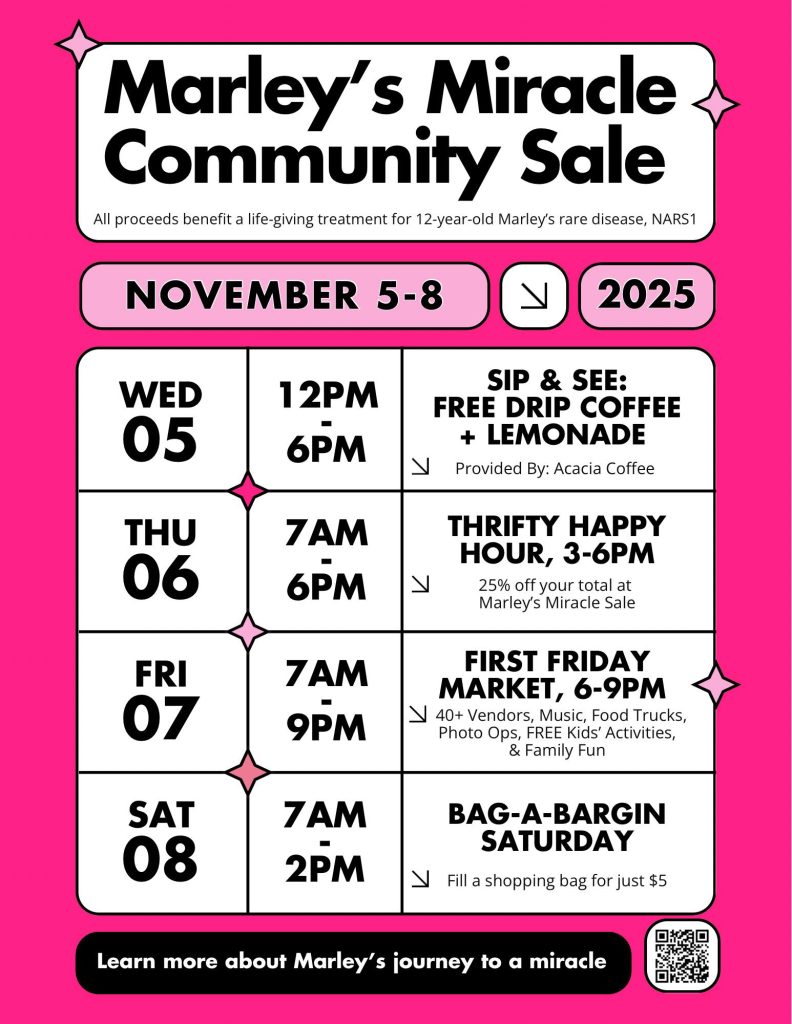 Those wanting to help can drop off quality donations from November 2–5 at Acacia Collective. Furniture, fashion, holiday décor, home goods, toys, and accessories are all welcome. This is your chance to declutter for good and help fuel Marley’s medical journey.