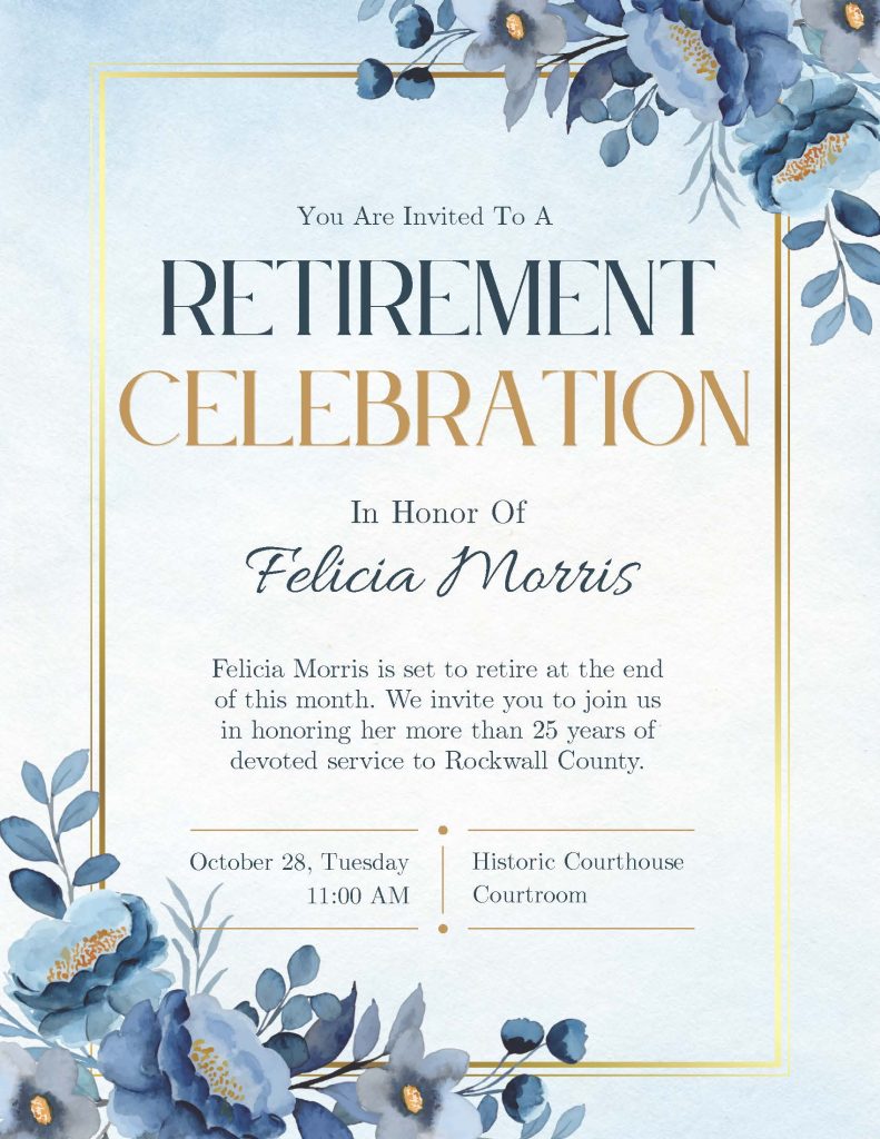 Rockwall, TX (October 21, 2025) – Felicia Morris is embarking on a new chapter as she retires, marking the end of a remarkable journey that has seen her become a beloved presence in the County Judge’s office at the Rockwall County Historic Courthouse.