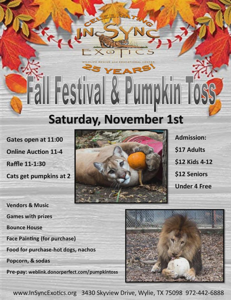 Wylie, TX (October 7, 2025) – Wylie’s In-Sync Exotics Wildlife Rescue and Educational Center is set to celebrate the season with their annual Fall Festival and Pumpkin Toss! The event on Saturday, November 1 offers tons of fun and family friendly activities for all – and a chance to watch the big cats receive their seasonal treats!