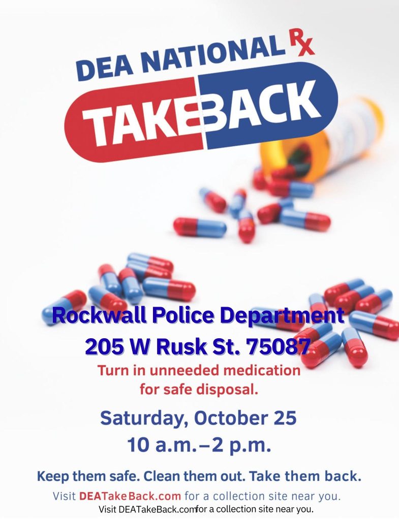 Rockwall, TX (October 20, 2025) – National Drug Take Back Day provides an opportunity to dispose of unused medication in a safe, secure, and convenient manner. Organized by the Drug Enforcement Administration and supported by police departments across the United States, the program helps ensure that unused prescriptions do not fall into the wrong hands or enter the public waterways.
