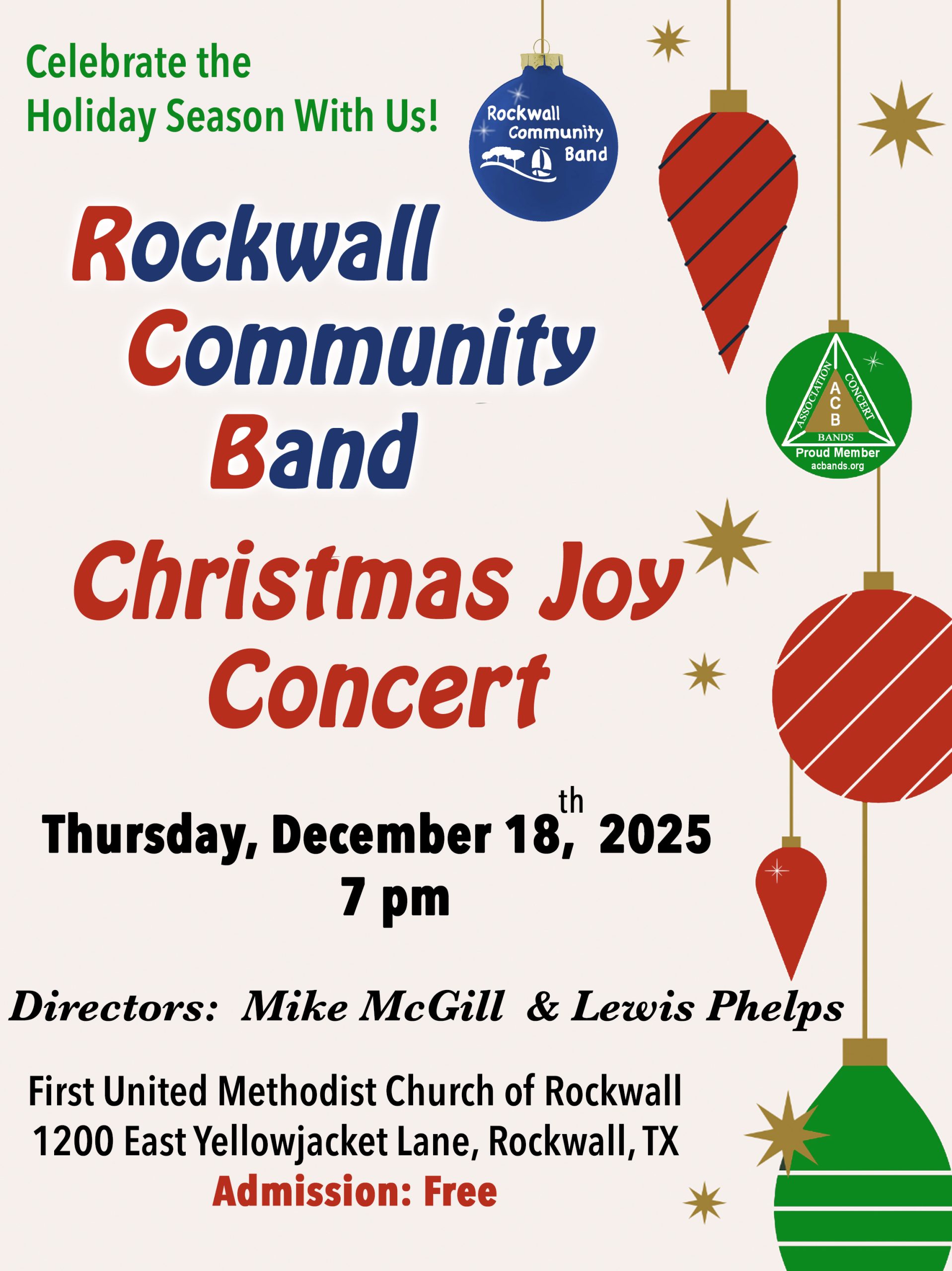 Rockwall, TX (November 13, 2025) – Join the Rockwall Community Band for a heartwarming evening of holiday music to kick off the Christmas season. The Christmas Joy Concert is scheduled for Thursday, December 18, at 7:00 p.m. at First United Methodist Church in Rockwall.