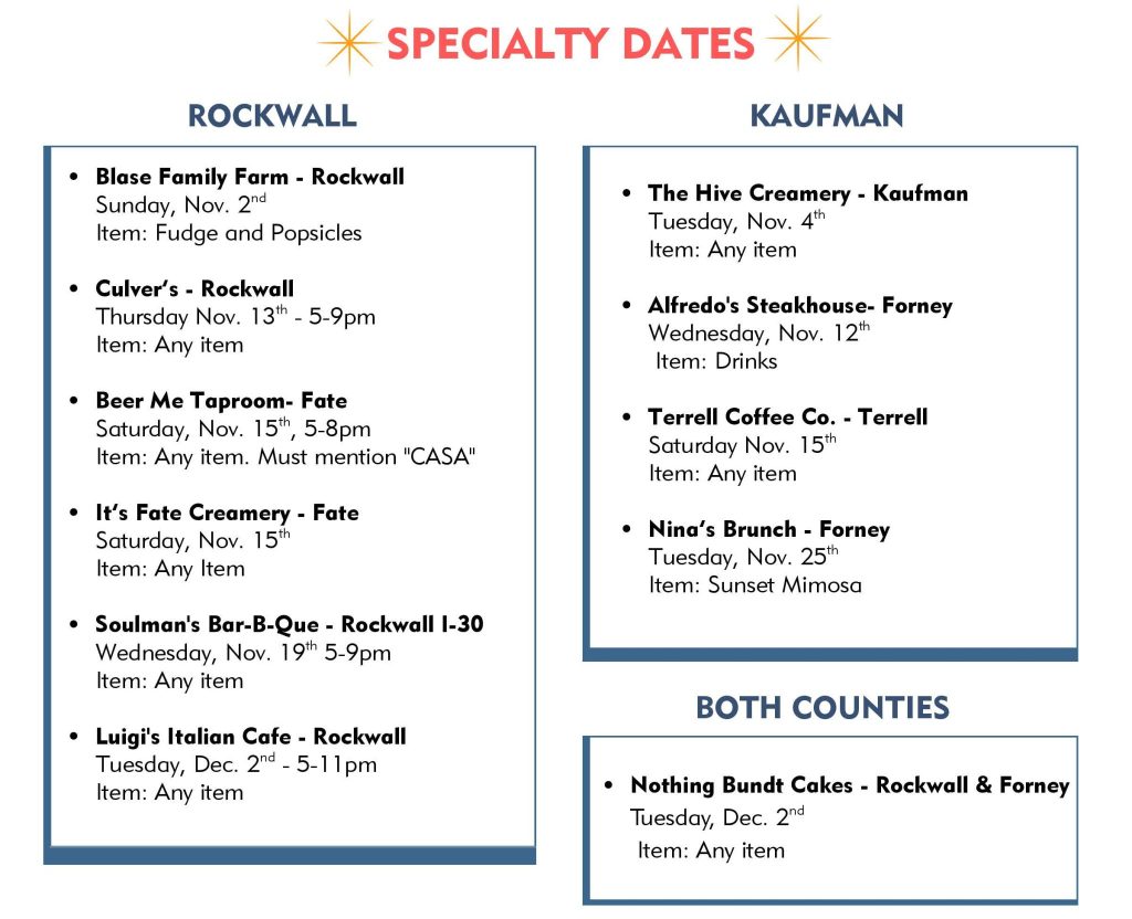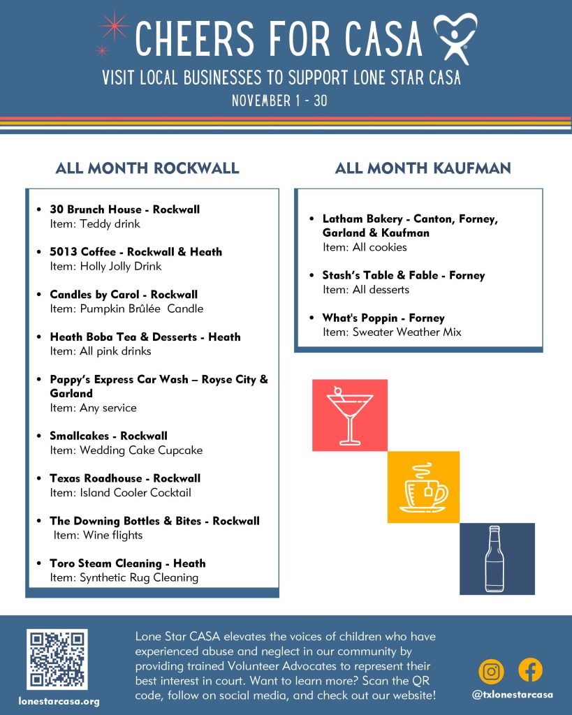 Throughout November, participating restaurants, cafés, and shops across Rockwall and Kaufman counties will donate a portion of sales from select menu items to benefit Lone Star CASA—an organization that trains and supports volunteer advocates for children who have experienced abuse or neglect.