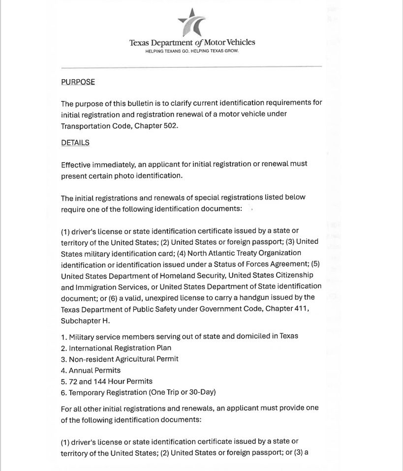 Rockwall, TX- November 24, 2025 – All tax offices in Texas were notified last week by the Texas Department of Motor Vehicles (TxDMV) that a valid ID is now required to register or renew your vehicle registration. This requirement applies whether you visit our offices in person or mail in your registration. If you choose to mail your registration, please be sure to include a copy of your valid ID.