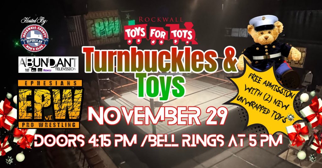 Next up, on Saturday, November 29 bring the family out for an exciting inaugural event – Turnbuckles & Toys, hosted by EPW Ephesians Pro Wrestling and the Rockwall Republican Men’s Club! This event, free with two new, unwrapped toys, brings six wrestling matches together for one great cause.
