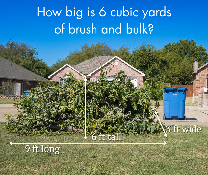 - January 1, 2026 – The size limit for bulk and brush collection will be 6 cubic yards per pickup.