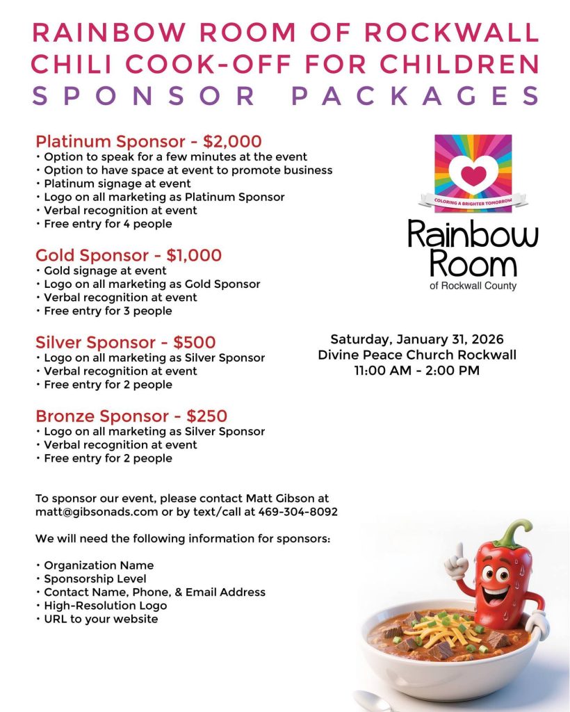 If you or your organization would like to sponsor the 2026 Rainbow Room Chili Cook-Off for Children, contact Matt Gibson at matt@gibsonads.com or call/text 469-304-8092 for details and sponsor sign-up.