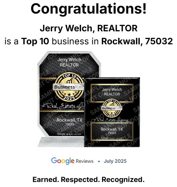 Rockwall, TX (December 30, 2025) – Google has named Jerry Welch, REALTOR an officially recognized TOP 10 of 2025 Rockwall, 75032 Award Winner in the Real Estate Agency category – an honor based on verified data from Google Reviews, as analyzed and certified by BusinessRate.