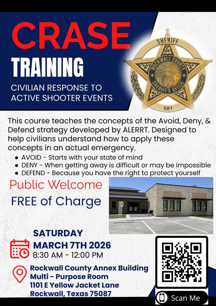 Rockwall, TX (January 22, 2026) – The Rockwall County Sheriff’s Office is hosting CRASE (Civilian Response to Active Shooter Events) training on March 7 from 8:30a.m. to 12:00p.m. The training, taught by local first responders, helps prepare citizens to respond during an emergency situation.