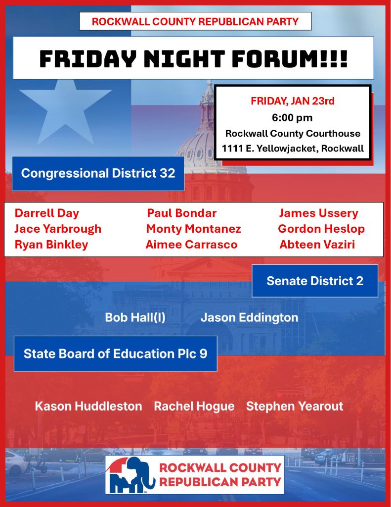 Rockwall, TX (January 19, 2026) – The Rockwall County Republican Party will host candidates for the new U.S. Congressional District 32 and other races at the Friday Night Forum on Friday, January 23, 6:00p.m., at the Rockwall County Courthouse, 1111 E. Yellowjacket Lane, Rockwall.