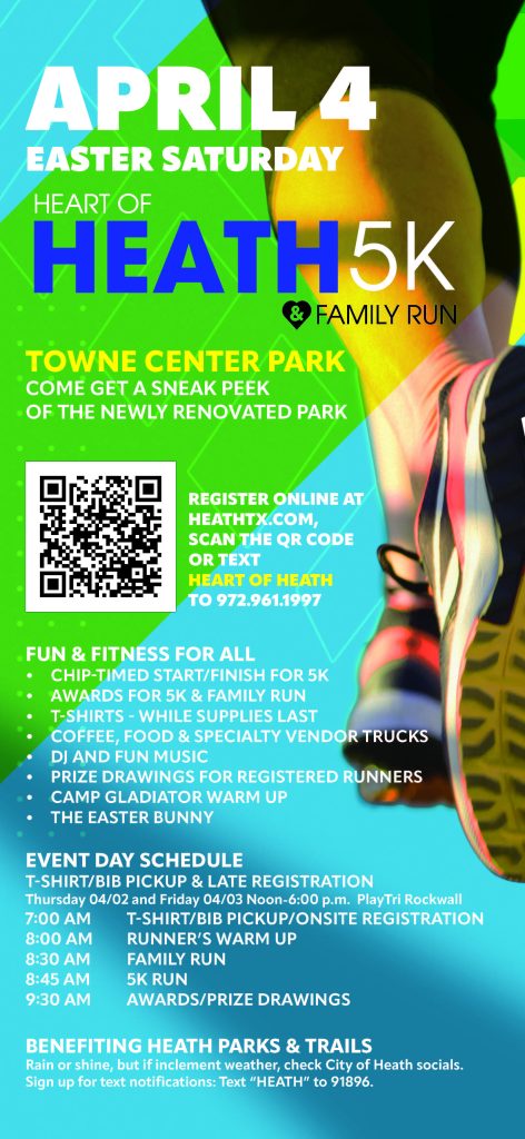 HEATH, TX (March 4, 2026) The 2026 Heart of Heath 5k/Family Run returns to Towne Center Park on Easter Saturday, April 4! Participants and guests will get a sneak peek of all the wonderful new amenities, plus enjoy a morning of fitness and fun!