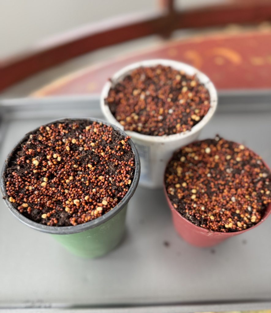 - Presoak 1-tsp of seeds for 6-8 hours in a dark cupboard. (Approx. 1 tsp of seeds for a 4 inch diameter container).