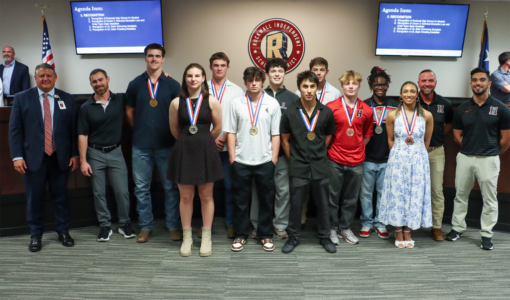 UIL Wrestling Medalists —Thirteen Rockwall ISD student athletes representing Rockwall High School and Rockwall-Heath High School either medaled or placed at the recent University Interscholastic League State Wrestling Championships. Congratulations to the following students and coaches: