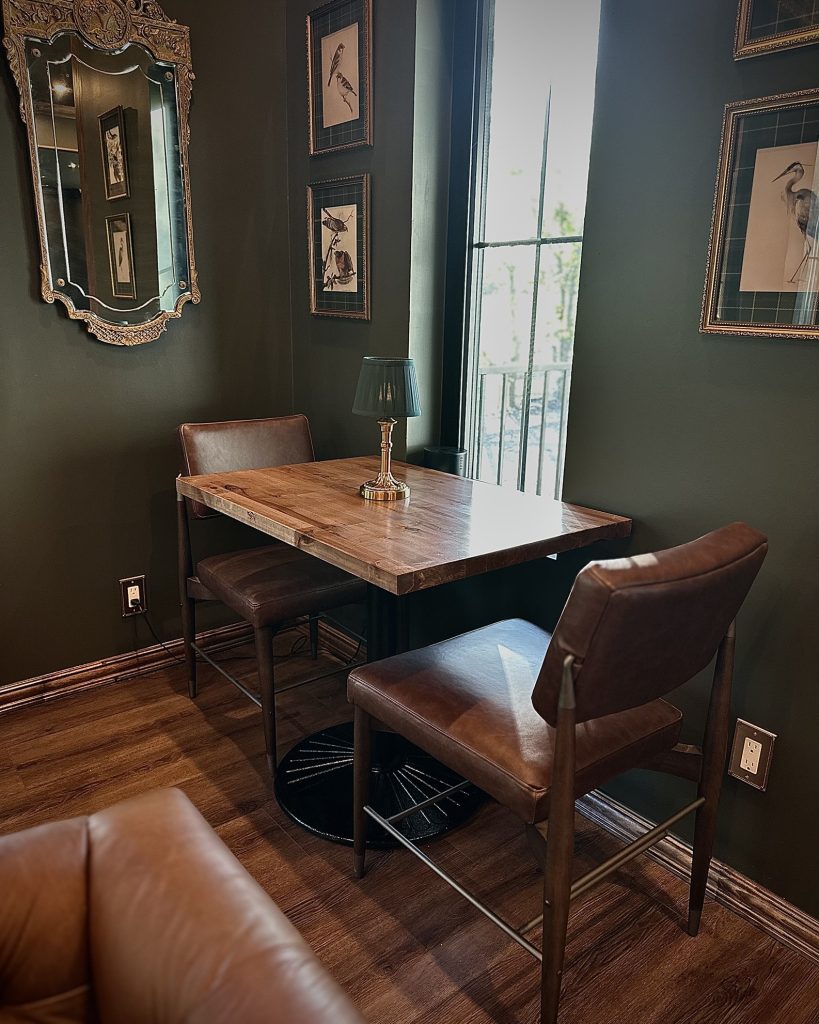 Think dark leather seating, rich hardwood finishes, and shelves lined with carefully curated spirits. The space feels intentionally layered—equal parts sophisticated and welcoming—inviting you to settle in and stay awhile.