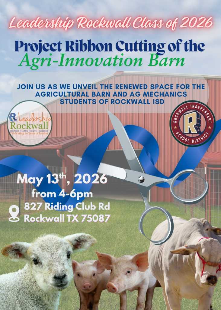 The 2026 Leadership Rockwall class will host a ribbon cutting on May 13, 2026, from 4–6 PM at the Agri-Innovation Barn, located at 827 Riding Club Road. The event will unveil renewed spaces designed to inspire agriculturally based learning, growth, and opportunity for Rockwall ISD students for years to come.